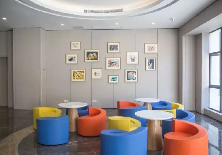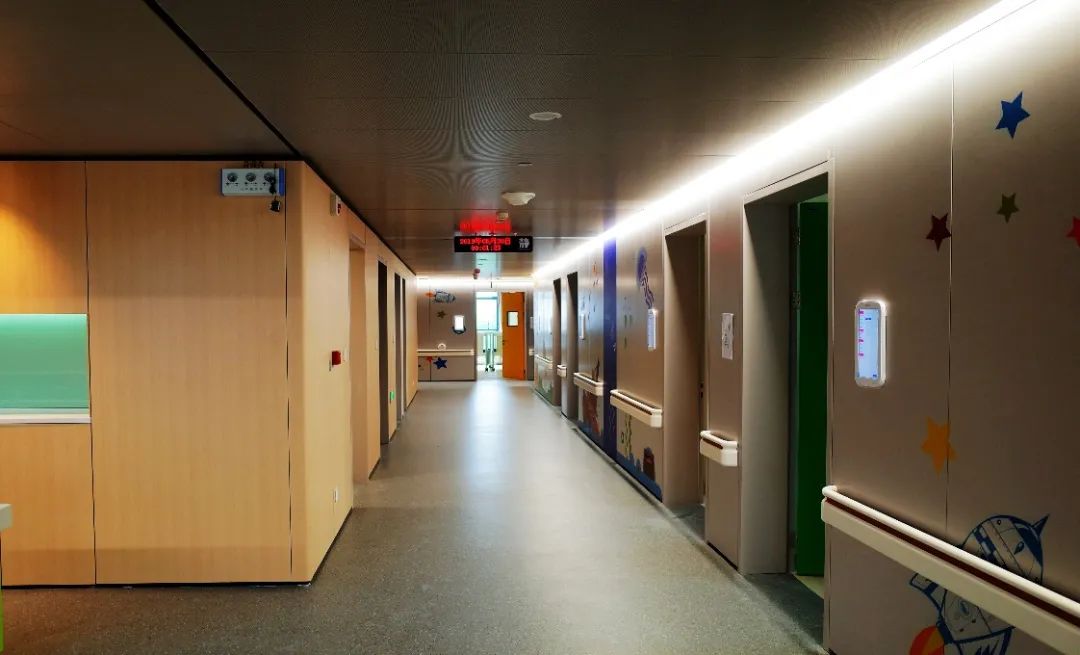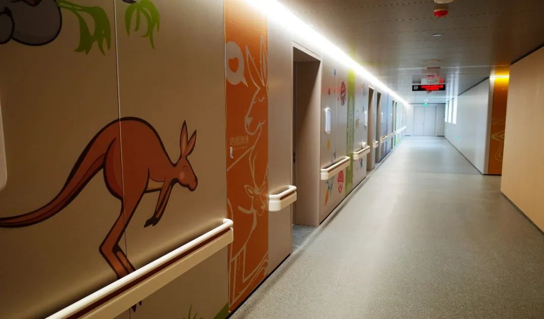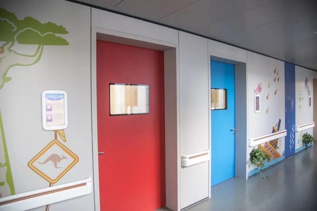 產科病房和兒科病房的墻面一改以往單調的色調,以紅、綠、藍、黃等色彩使室內空間五彩斑斕,兒科病房的墻面印刷上了許多的卡通圖案,使之既色彩豐富,又迎合了產科溫馨、兒科活潑的要求。