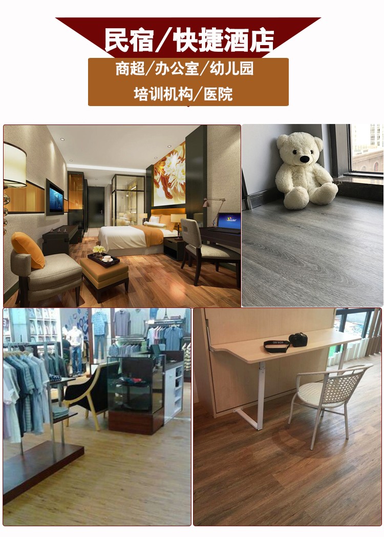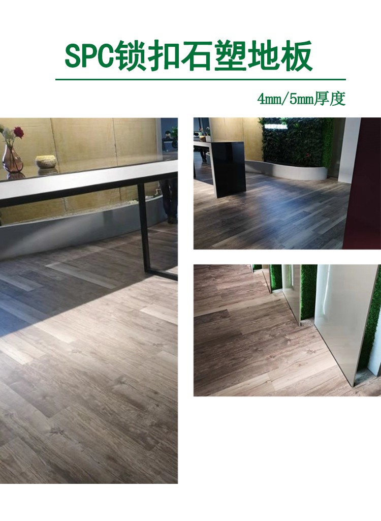 介紹:spc鎖扣石塑地板,又稱為pvc鎖扣地板,卡扣式免膠安裝 ,0甲醛環(huán)保安全 ,防水防滑,耐磨阻燃,特別合適于:酒店公寓,超市店鋪,家裝民宿,咖啡廳茶樓等場所,防火級別:B1級阻燃 ,耐磨度:T級耐磨,厚度:4mm/5mm,花紋:仿木紋,仿大理石紋,仿地毯紋