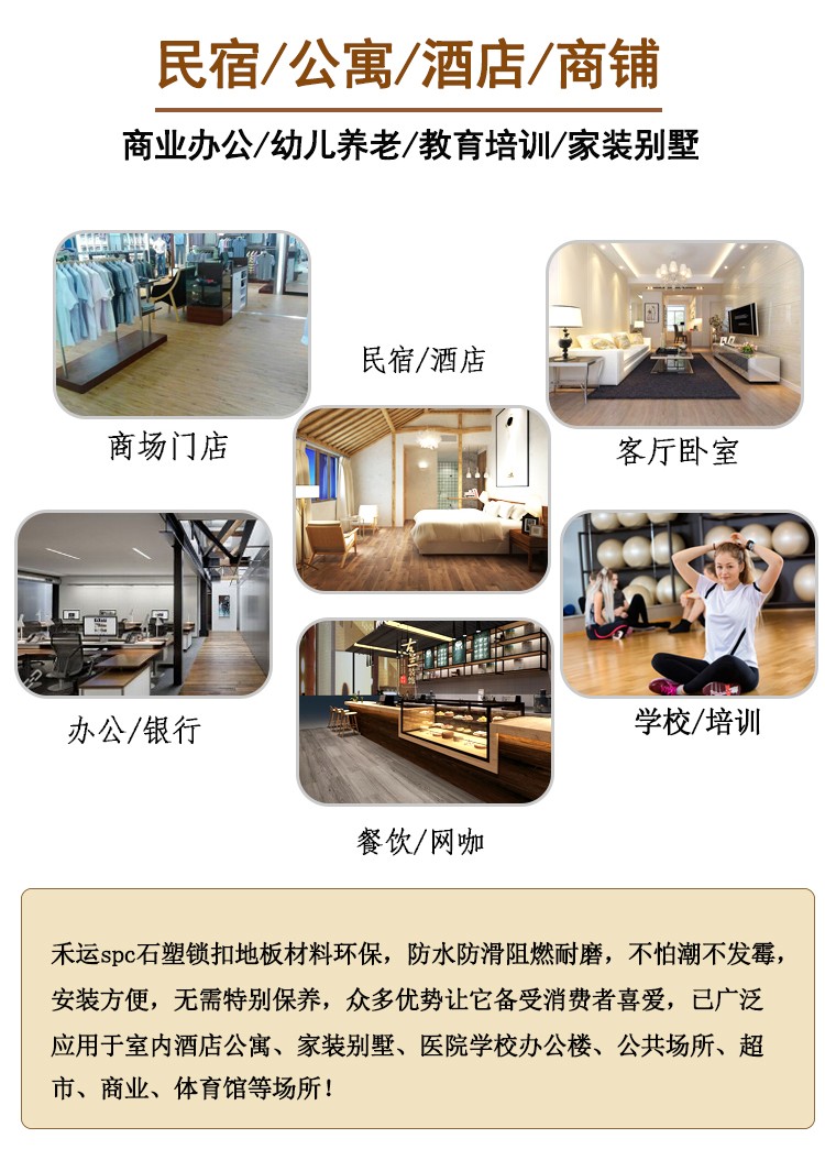 介紹:spc鎖扣石塑地板,是由鈣粉、聚氯乙烯穩(wěn)定劑組合的一定比例混合形成復合地鋪材料。是現在非常流行的一種無醛環(huán)保地板,極為穩(wěn)定、高性能、完全防水、高密度銷售芯、耐壓痕;它可以很容易地安裝在不同類型的地面基地,混凝土,陶瓷或現有的地板,非常適合用于舊地面改造,老舊瓷磚木地板地毯等地面翻新使用。安裝快速簡單,材料環(huán)保無味,即鋪即用。是響應國家減排而發(fā)明的新型材料,是100%不含甲醛的環(huán)保地板,是真正的0甲醛地板。因其厚度薄、花色多、款式全、低碳環(huán)保的性能可廣泛應用于幼兒園、醫(yī)院、辦公室、寫字樓、商場、家居、酒店、公寓、別墅、KTV等公眾場所。
